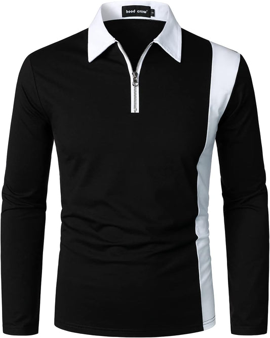 Mens Long Sleeve Polo Shirts Fashion Color Block Zipper T Shirts