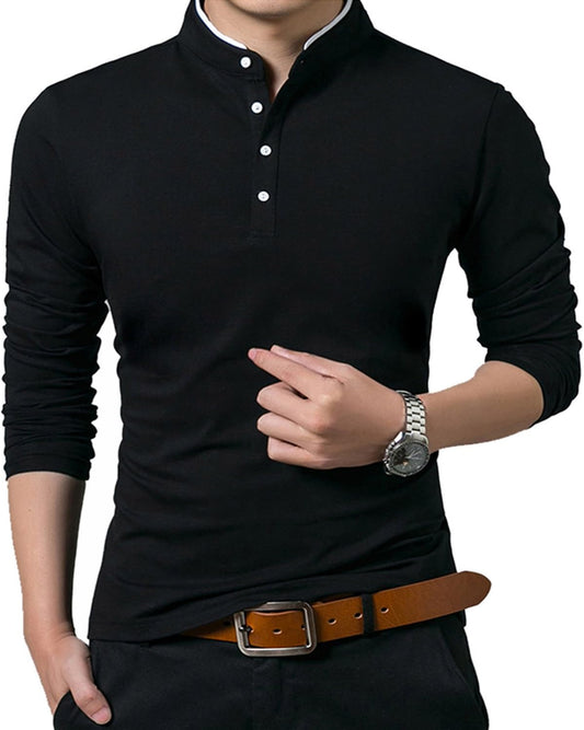 Men Casual Long Sleeve Polo Shirts Mandarin Collared Slim Fit Fashion Cotton Tops